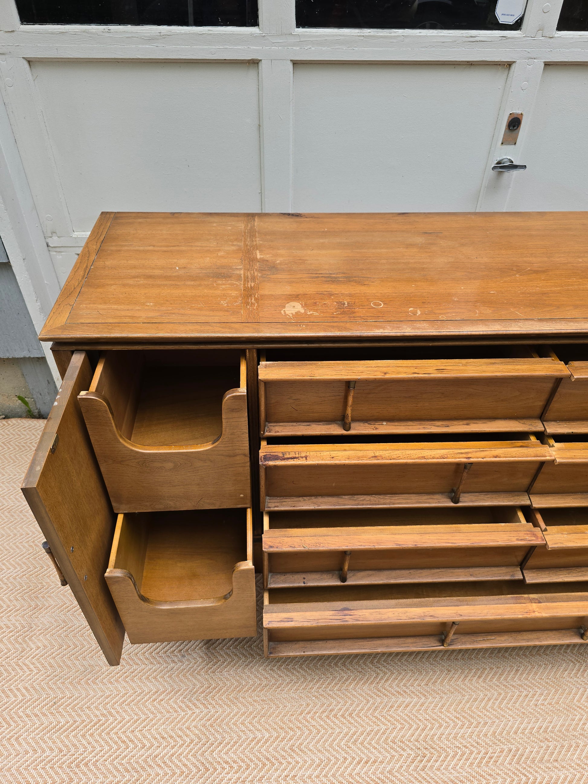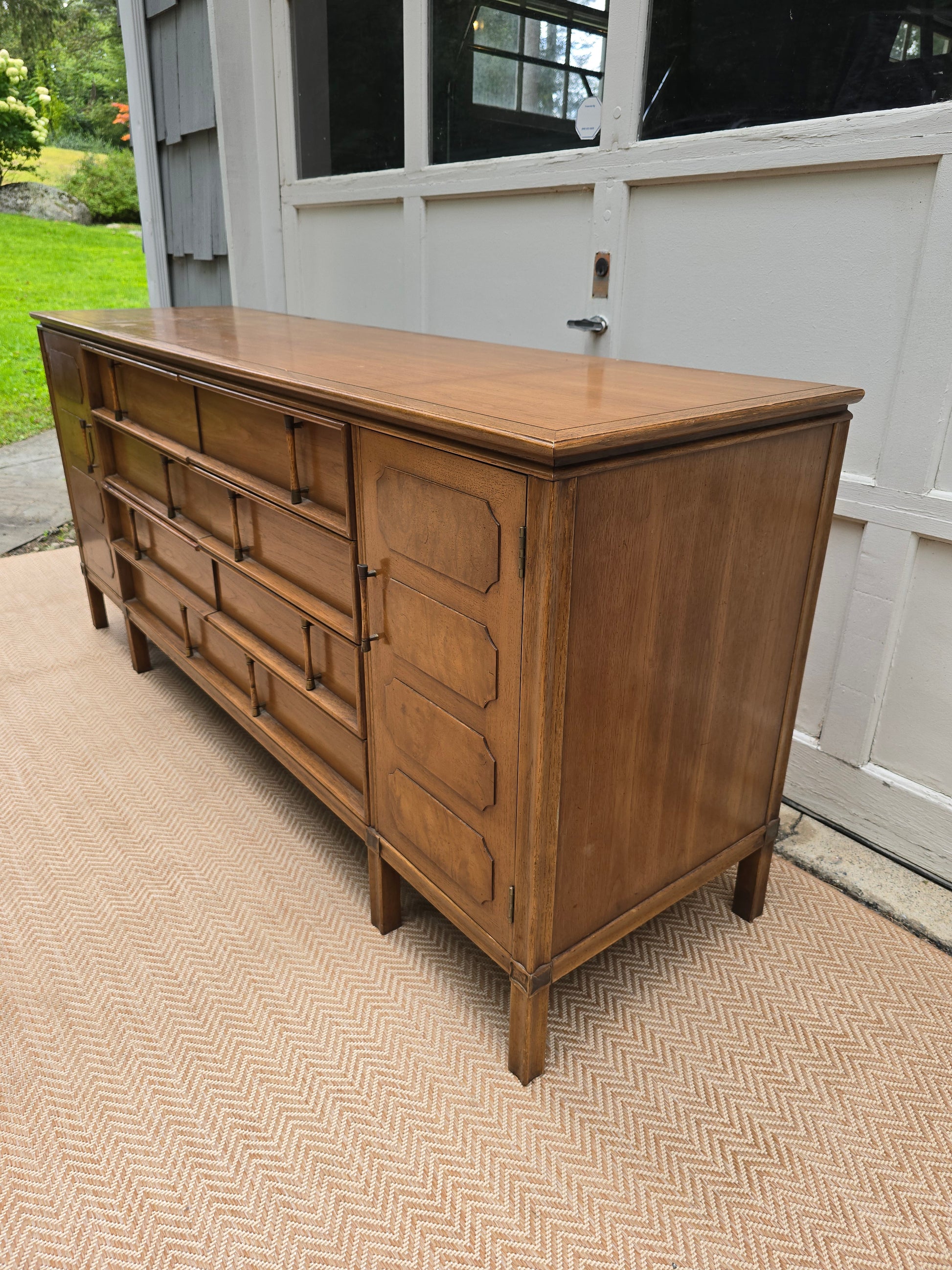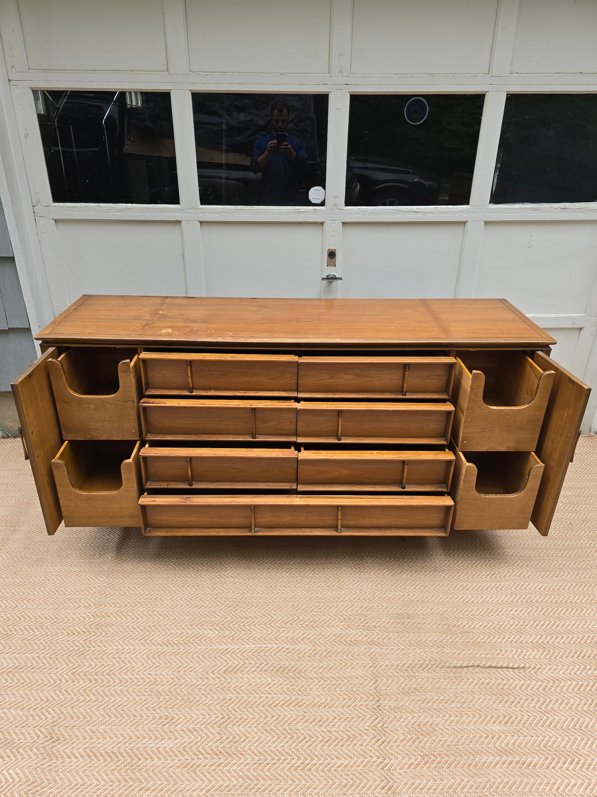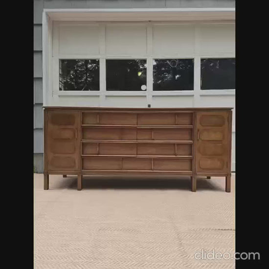 This large credenza from the Thomasville Tamerlane collection was crafted in the 1960s and designed in the Hollywood Regency style. The piece is constructed from solid wood with burled inlay panels and faux bamboo detailing, creating a distinctive and elegant aesthetic. Dovetail joint construction provides strength and durability, while double side cabinets and central drawers offer versatile storage. The credenza has been professionally refinished, allowing its warm wood grain and intricate design to be fully appreciated.