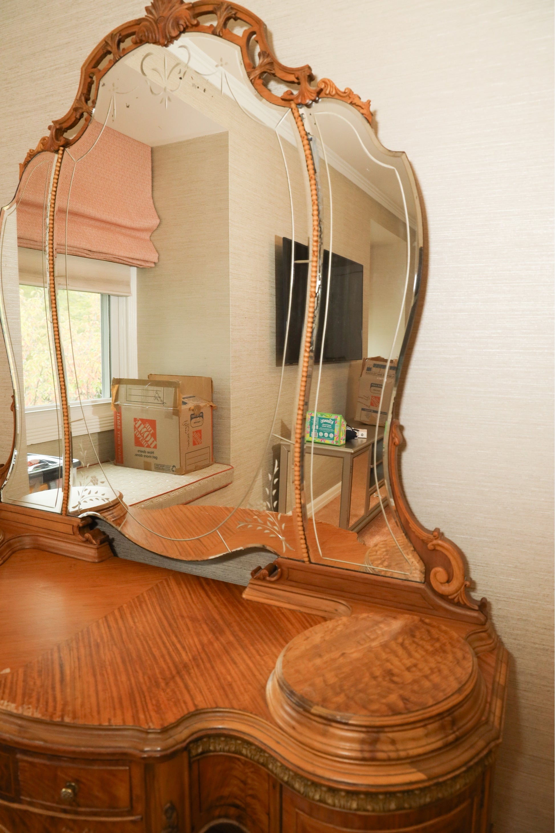 Antique French Rococo Vanity with Etched Mirror – Hand-Carved Burled Wood