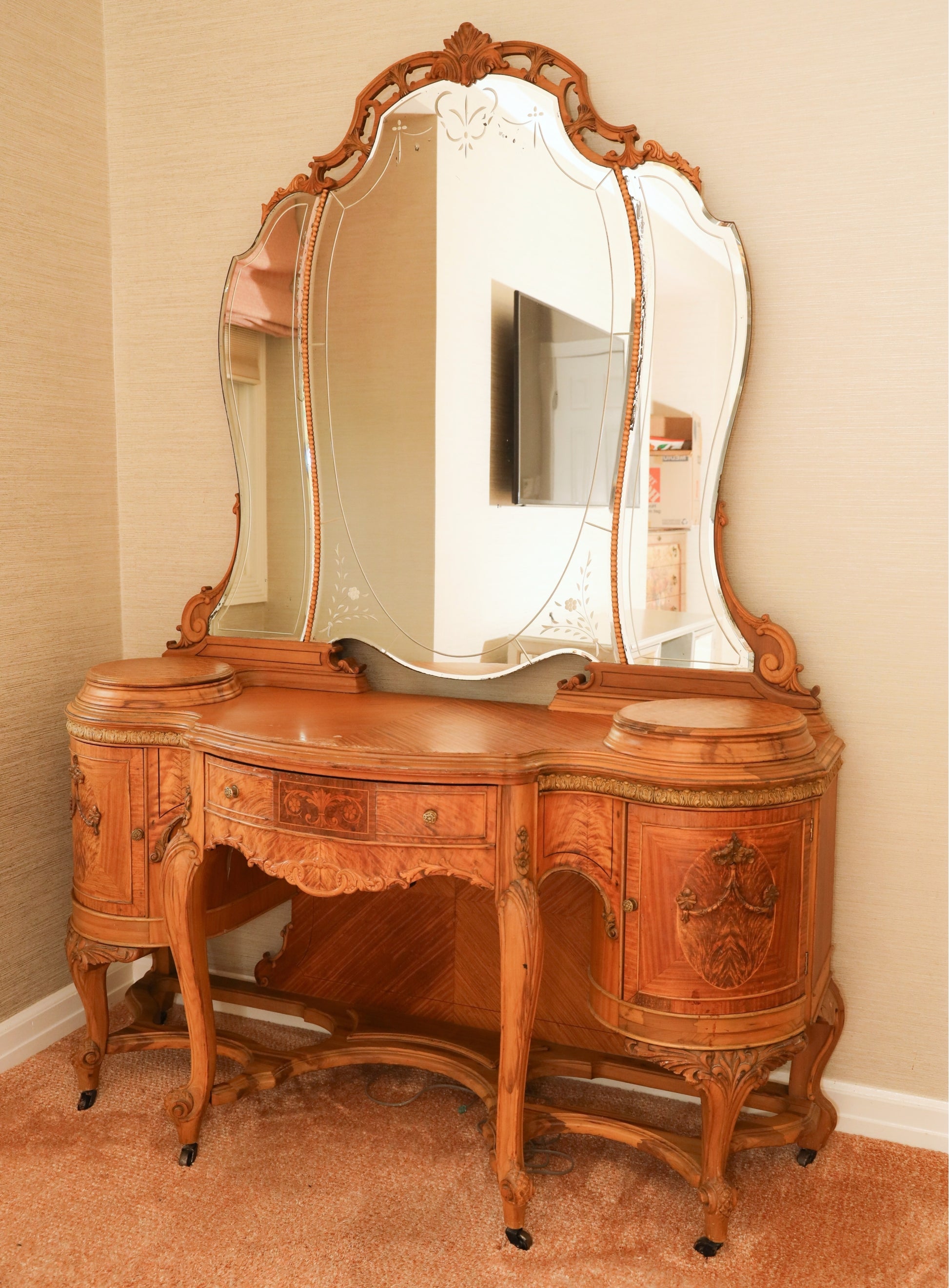 This exquisite antique French Rococo vanity is a true statement piece, showcasing exceptional craftsmanship and ornate detailing throughout. The grand triple-panel mirror features elegant etched designs and a beautifully carved crest, adding refined old-world charm. The serpentine front, carved cabriole legs, and inlaid wood patterns highlight the artistry of its construction, while the curved side compartments and center drawer offer functional storage. Ideal for luxurious bedrooms, boutique dressing spaces, or antique-inspired interiors, this vanity brings timeless European elegance to any setting.