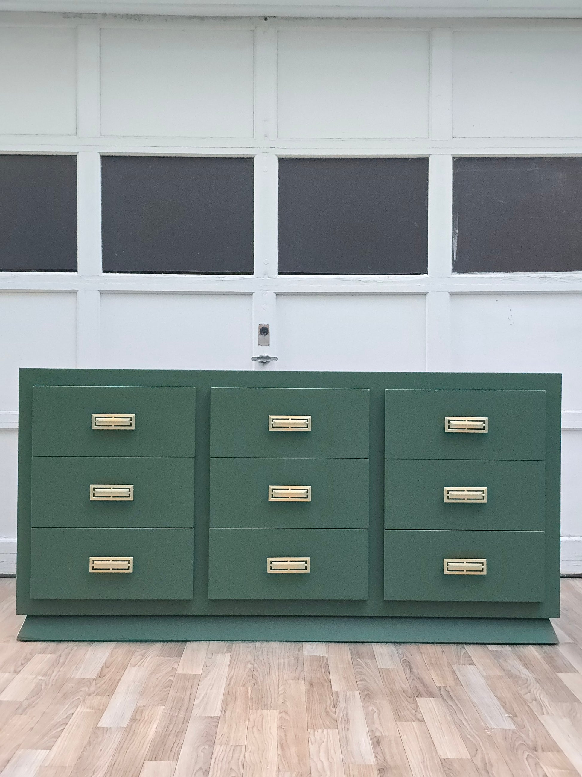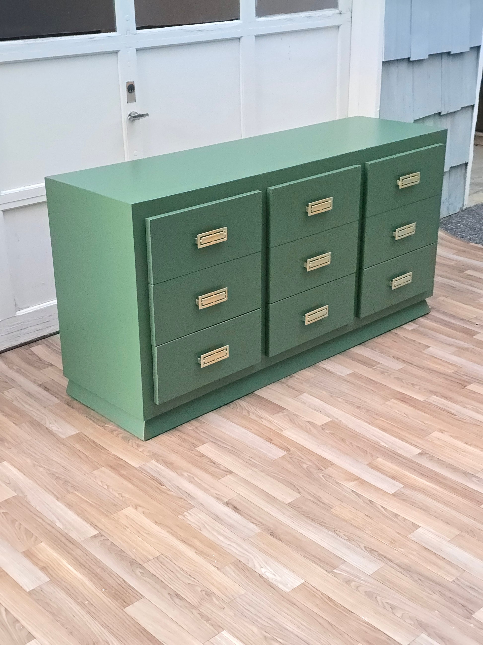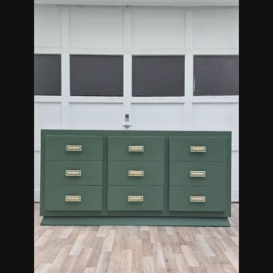 This striking campaign-style dresser has been hand-refinished in a sophisticated botanical green, offering a perfect blend of bold modernity and timeless structure. The piece features nine deep drawers framed within a strong, linear silhouette, each adorned with recessed brass campaign pulls that gleam elegantly against the matte green finish.