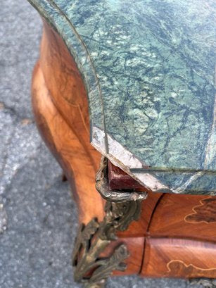 There is a visible chip on one corner of the marble top, as shown in the photos. The damage is stable and does not affect the structure or overall integrity of the piece. Please review images carefully before purchase.
