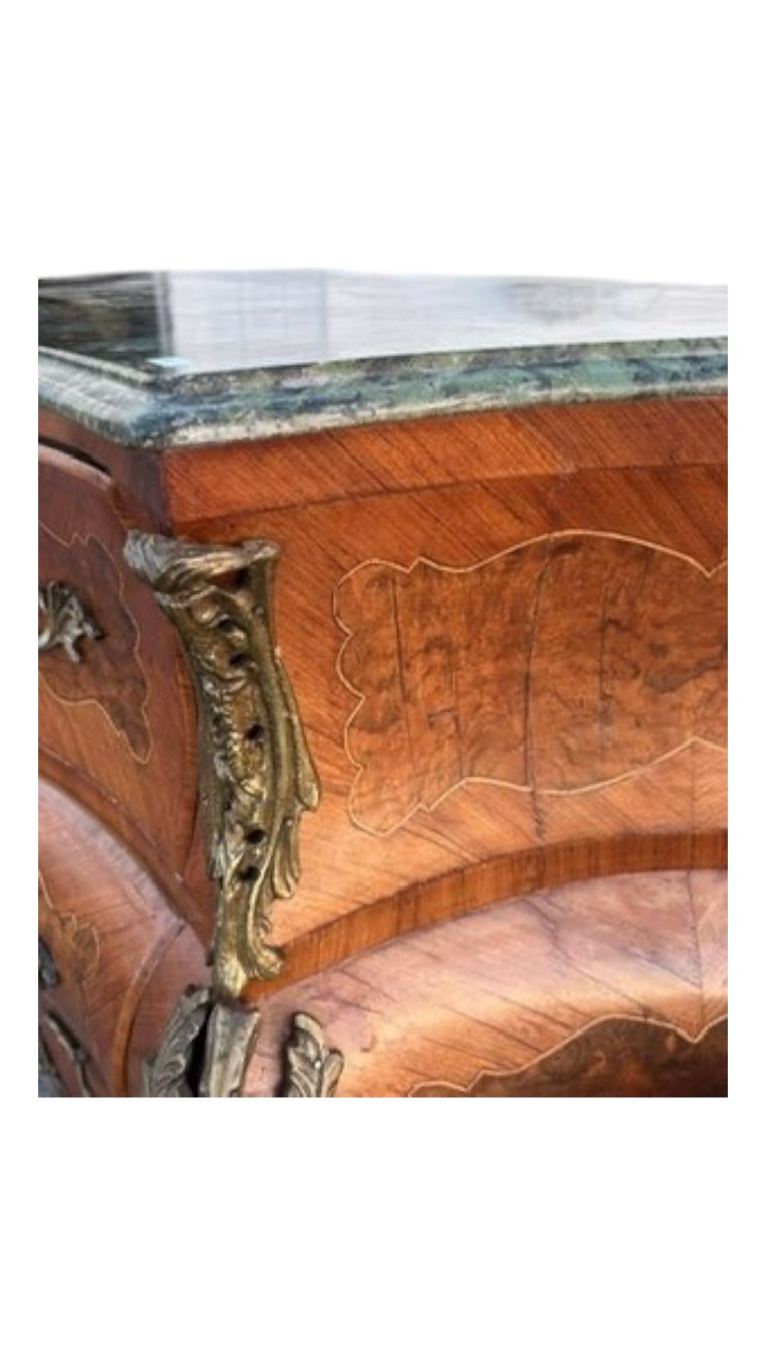 Louis XV Bombe Chest – Antique Three-Drawer Dresser with Inlay and Marble Top