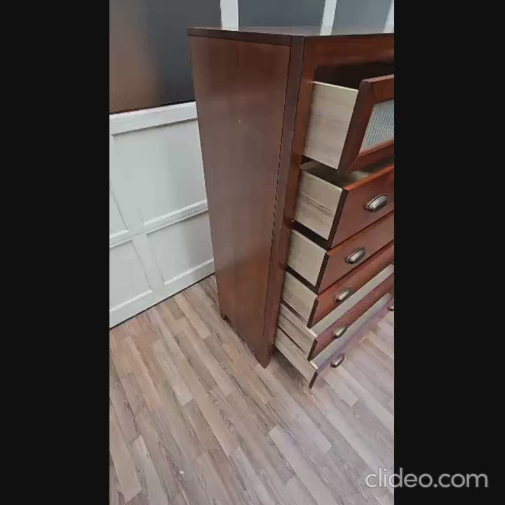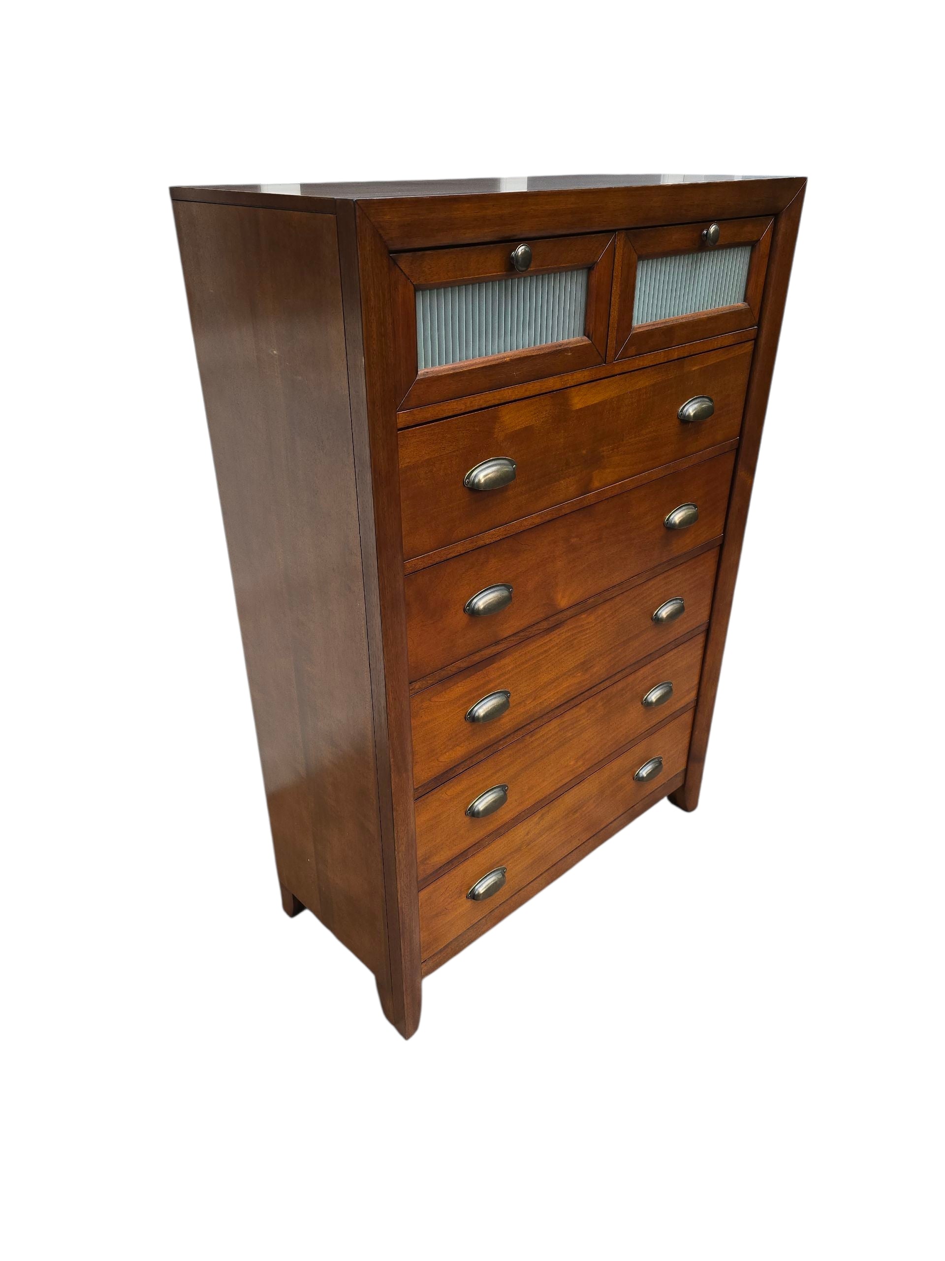 Mid-Century Modern Tallboy Dresser – Vintage 5-Drawer Chest with Glass Top Drawers and Brass Cup Pulls