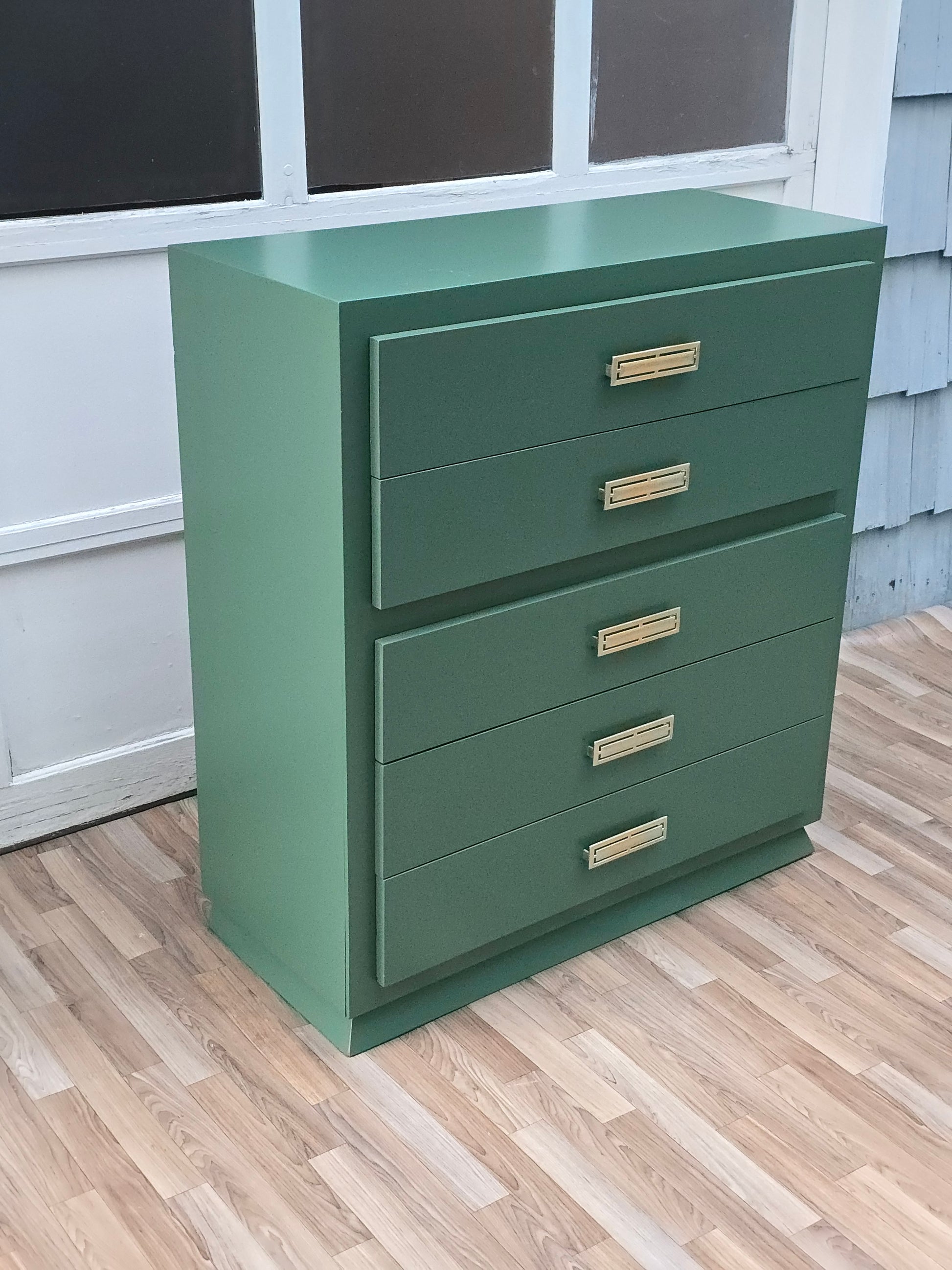 Modern Green Dresser | Hand-Refinished Forest Green 5-Drawer Chest with Brass Handles