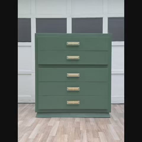 This modern green dresser combines clean architectural lines with rich, handcrafted detail. Finished in a deep matte forest green, the piece features a stepped, layered profile that adds depth and structure to its minimalist form. Each of the five spacious drawers glides smoothly and is accented with brushed brass handles, giving a warm contrast against the cool green finish. Refinished by hand for a smooth, durable surface, this dresser offers both style and storage—perfect for modern, transitional, or mid-century inspired interiors. Use it as a bedroom dresser, entryway chest, or statement storage piece in any room.