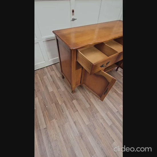 This French-inspired sideboard captures the warmth and character of Provincial craftsmanship. Constructed from solid wood with a honeyed chestnut finish, it features two paneled cabinet doors framed by soft scalloped edges and three upper drawers accented with ornate brass pulls. The curving apron and cabriole legs add a graceful profile, while the simple symmetry lends timeless charm.