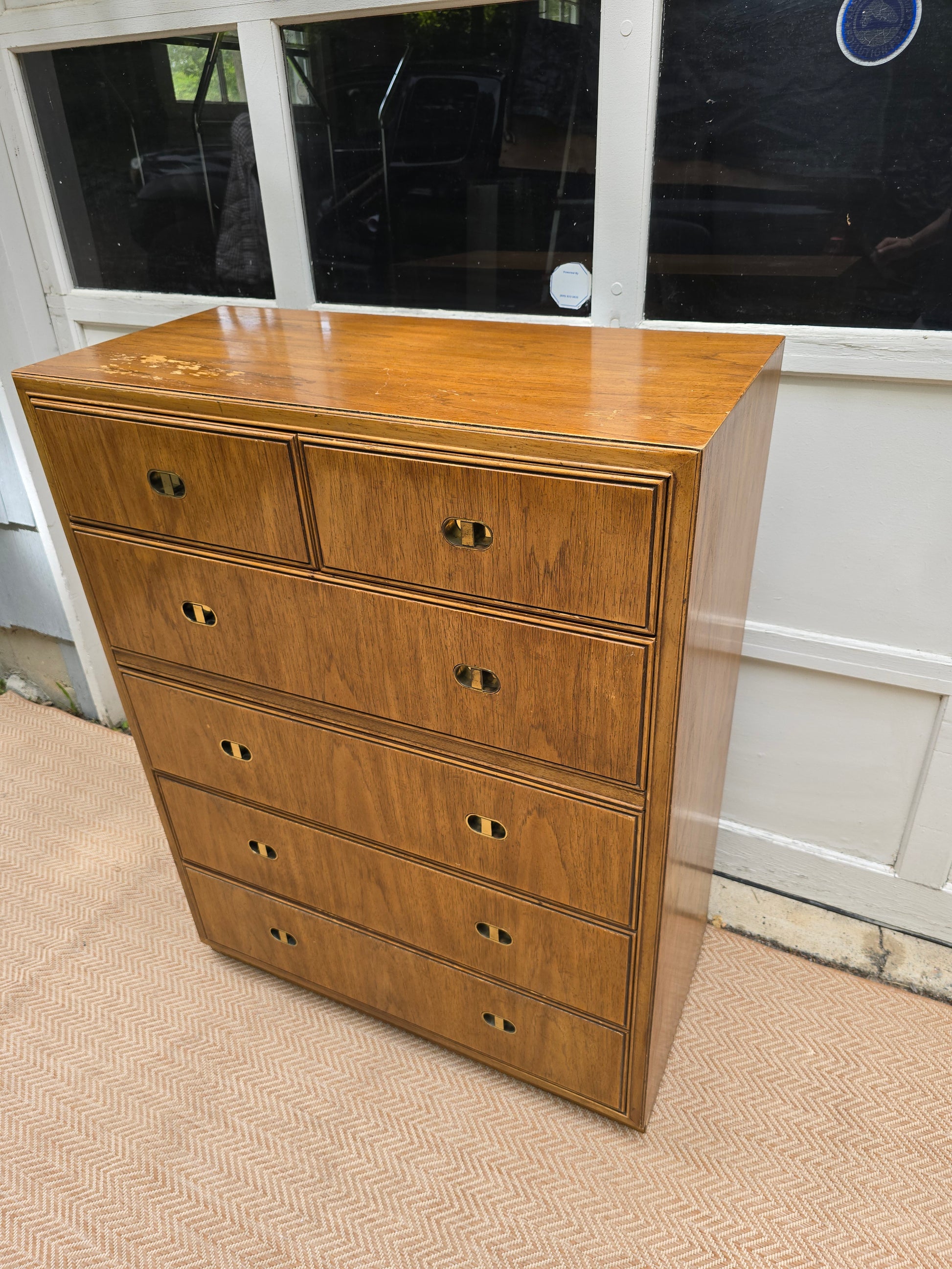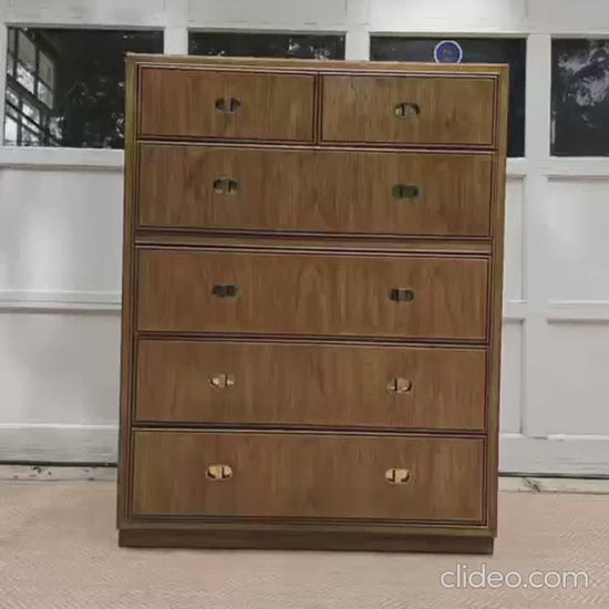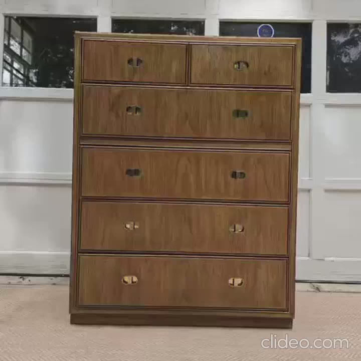 This tallboy dresser by Drexel is crafted from solid wood and finished in a warm walnut tone that highlights the natural grain. Original brass inset pulls have been retained, offering a sleek and minimal design detail characteristic of Mid-Century Modern furniture. The piece has been professionally refinished to restore its timeless appearance while maintaining its sturdy construction. With six spacious drawers, ample storage is provided for clothing, linens, or keepsakes.