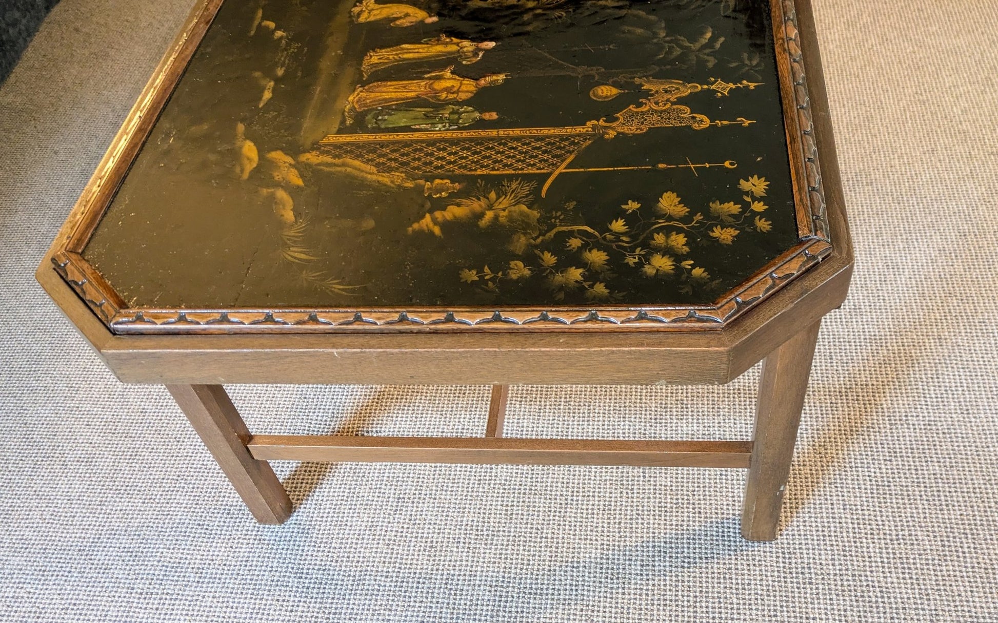This vintage Chinoiserie coffee table is a striking artistic piece featuring a hand-painted lacquered glass top depicting an elegant Asian garden scene with figures, pagodas, and lush foliage. The artwork is detailed in rich gold tones against a deep black background, protected beneath a beveled glass surface. The wooden frame and legs feature carved details and an octagonal edge, giving the table a refined architectural presence. Perfect as a living-room centerpiece or accent table, this piece adds timeless character, history, and visual richness to any interior.