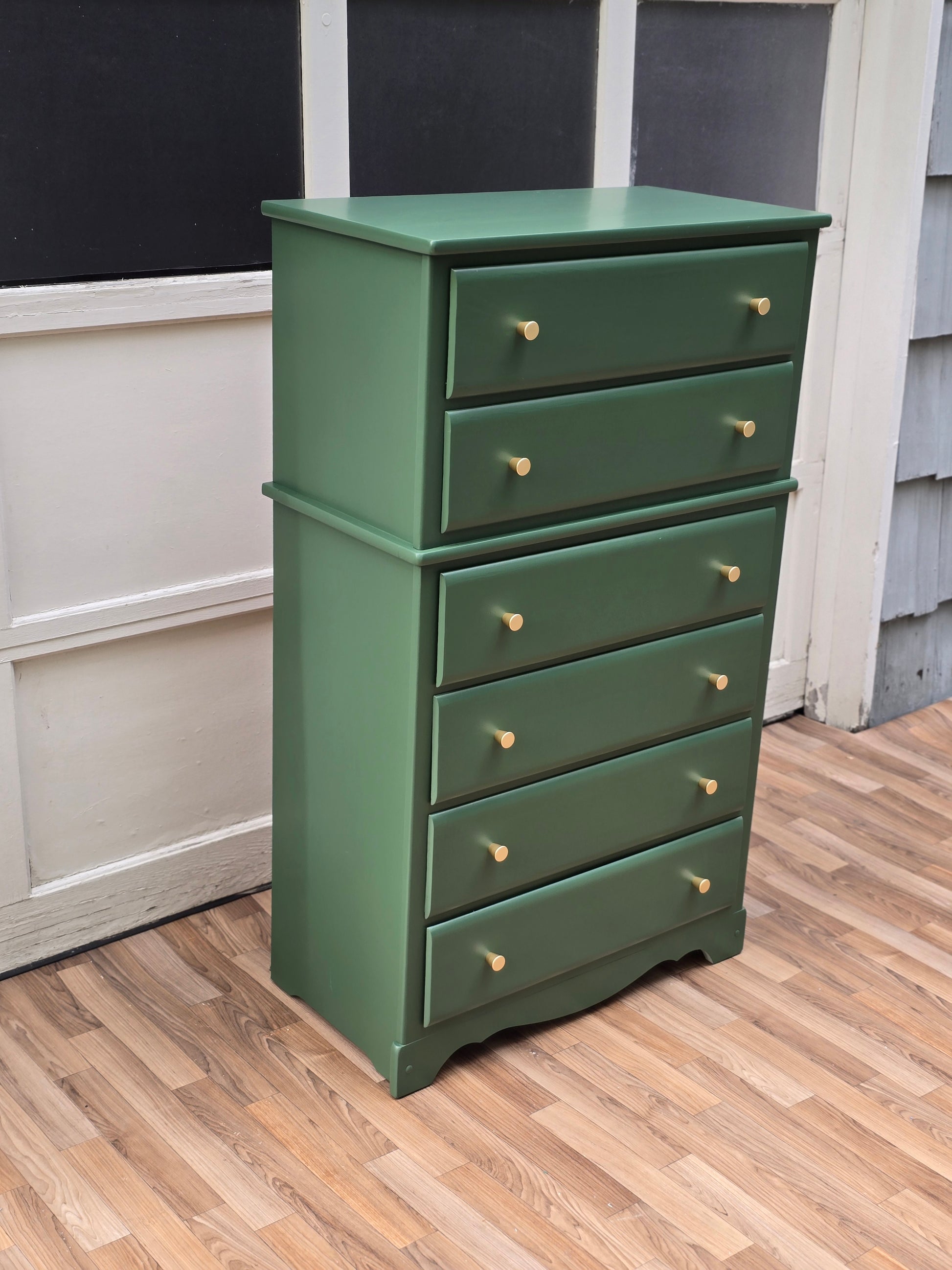 Vintage Green Tall Dresser | Hand-Refinished Modern Cottage Chest with Brass Knobs