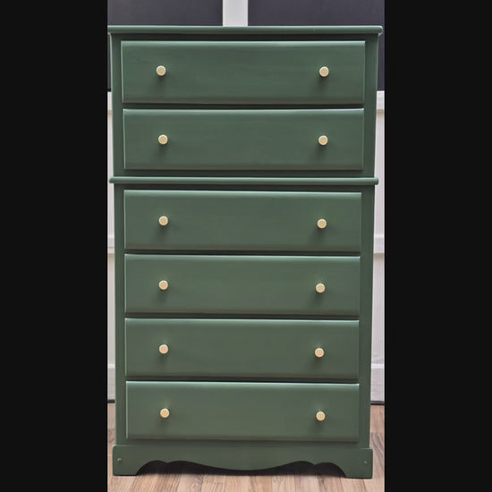This refined tall chest blends classic craftsmanship with a modern cottage sensibility. Hand-refinished in a deep botanical green satin lacquer, it features six spacious drawers fitted with warm brass knobs for a subtle yet sophisticated contrast.