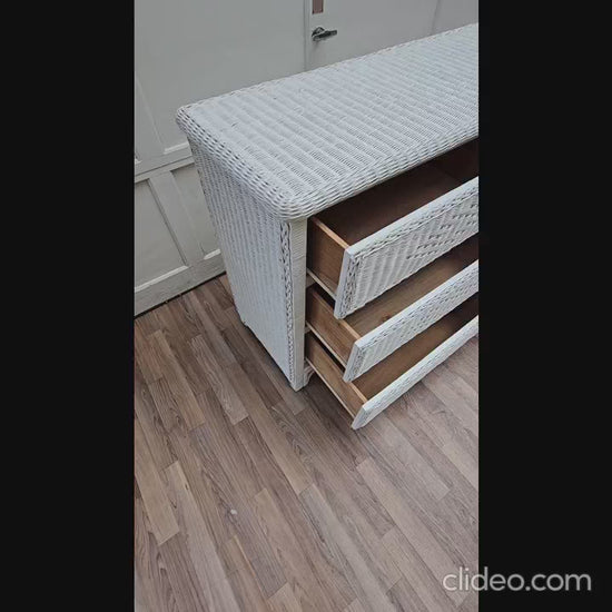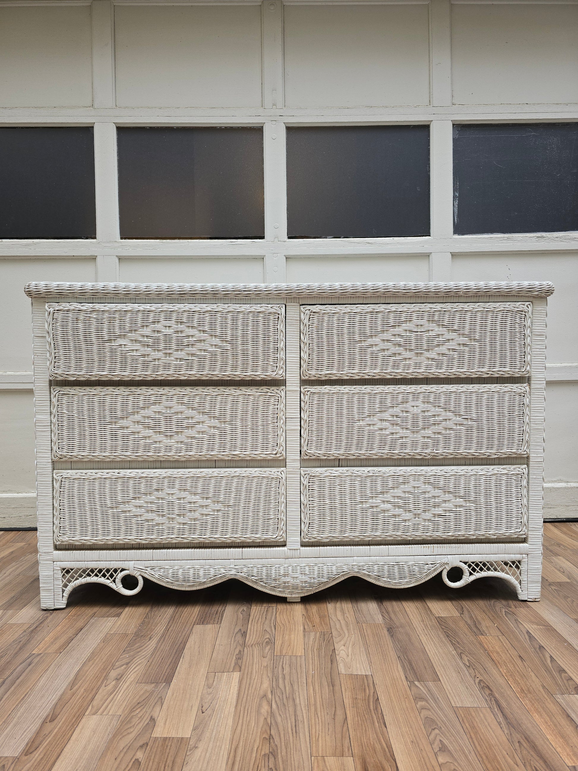 White Wicker Dresser, Coastal 6-Drawer Chest, Bohemian Beach Cottage Furniture, Vintage Rattan Dresser in Coastal White Finish